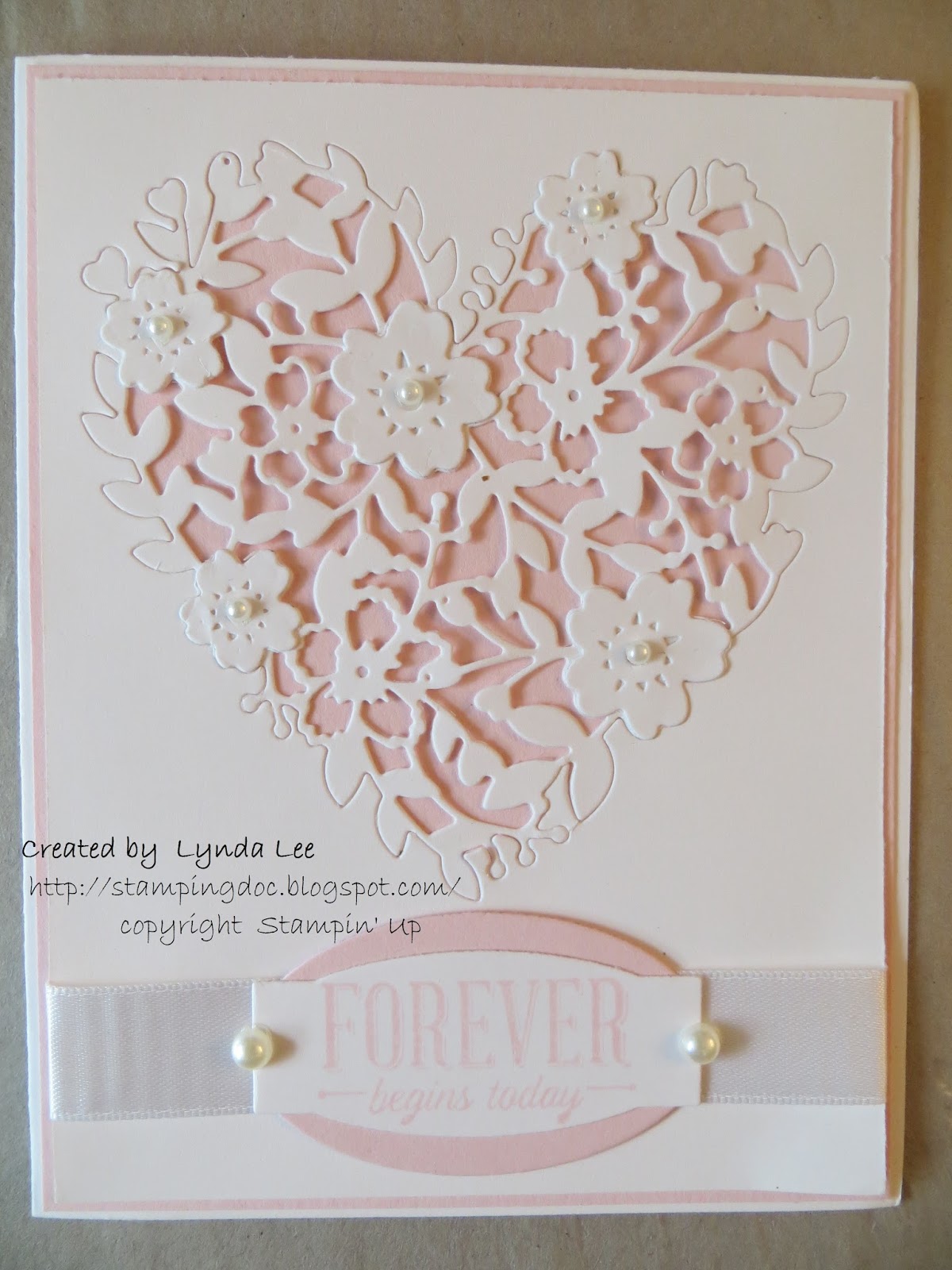 Pink Pirouette is such a girlie color- living with all boys I really love a little pink every once in a while. I wanted to use this die for a wedding card- a little pink behind the die is a really subtle way of adding a bit of color. added some pearls to add a little sparkle. the sentiment from Suite sayings stampset was stamped with Pink Pirouette and diecut with Project Life Cards & Labels die with a layer of Pink Pirouette diecut with the small oval from Ovals collection Framelit. The whole thing was layered over the 5/8" whisper white satin ribbon. More pearls on either side - very bridal I think.