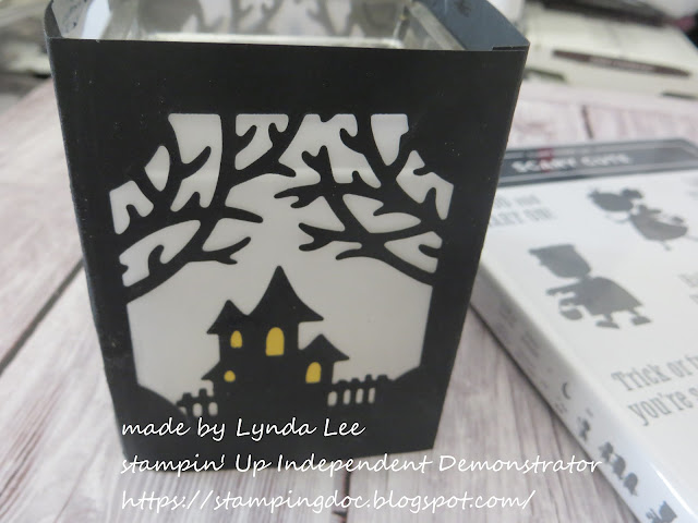 Add a piece of DSP from Celebrate everything hostess paperpack. Diecut the scary cute frame and house, put some scrap Daffodil delight behind the windows and diecut the moon and some bats from the black CS and mount as shown.